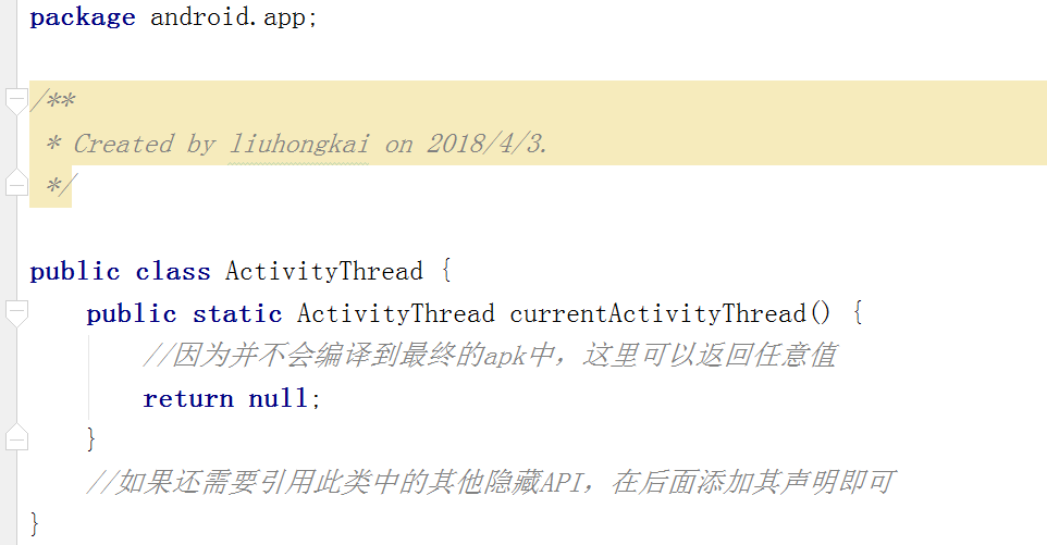 之后在 libfakeandroid中新建一个类android.app.ActivityThread ,并添加需要调用的隐藏API,如下