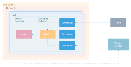 同一个容器内由Starter 启动多个 Twemproxy 实例并绑定到同一个端口,由操作系统进行负载均衡,对外仍然暴露一个端口,但是内部已经由系统均摊到了多个 Twemproxy 上。
