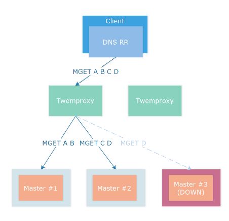 当时由于情况紧急,只能建立多个Twemproxy Group,提供多个 DNS A Record 给客户端,客户端进行轮询或者随机选择,该方案可用,但是不够优雅。