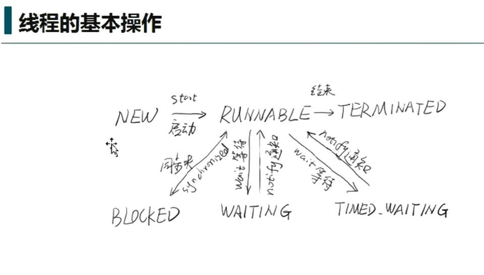 线程new出来调用.start()启动后,进入Runnable状态(执行或者待执行),申请锁可能进入阻塞状态(BLOCKED),调用.wait()方法进入有限期等待(WATING)状态或无限期(TIMED_WAITING),等到.notify()方法通知才能回到Runnable状态,执行结束后进入Terminated状态。