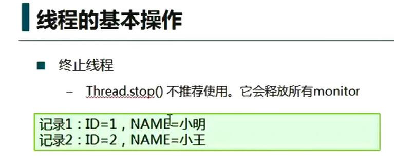 不推荐使用,逃过暴力,用为会立即释放monitor资源,如果一给线程写入数据只写入了一般就被.stop()终止了,就会导致数据不完整。