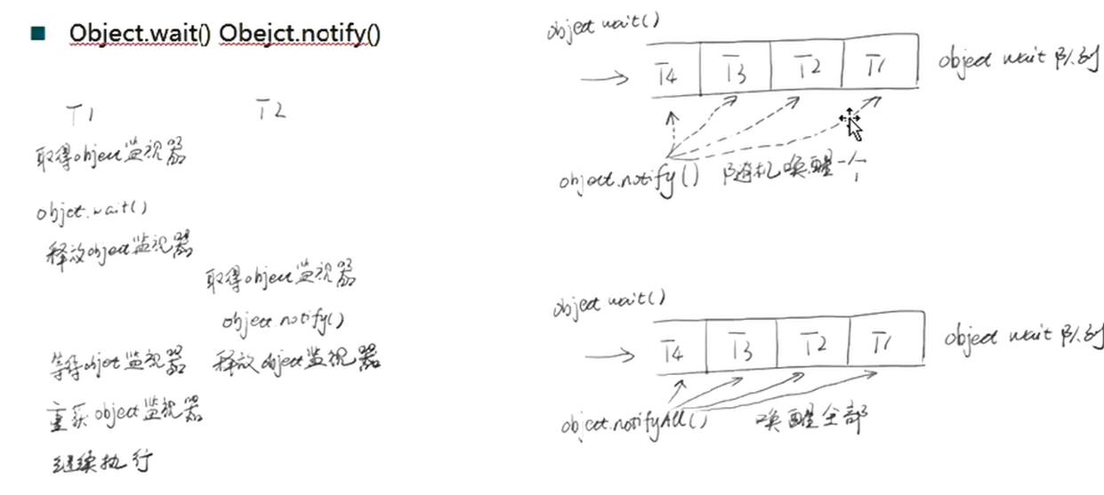 等待.wait()方法会释放object监视器,等待另一个线程.notify()获取到object监视器后并且执行完后续操作后才会唤醒.wait()的线程。