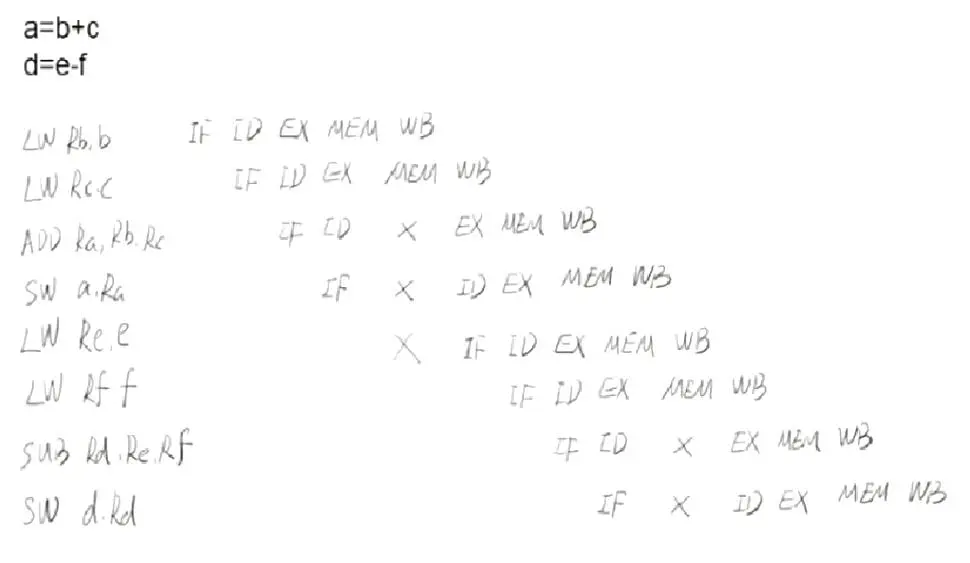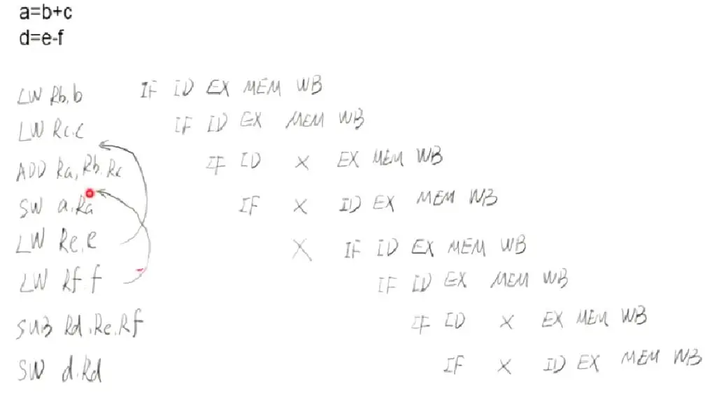 因为进行运算指令时,需要用到C的值,需要在MEM步骤后才能访问到,所以3排和倒数第二排有个×;