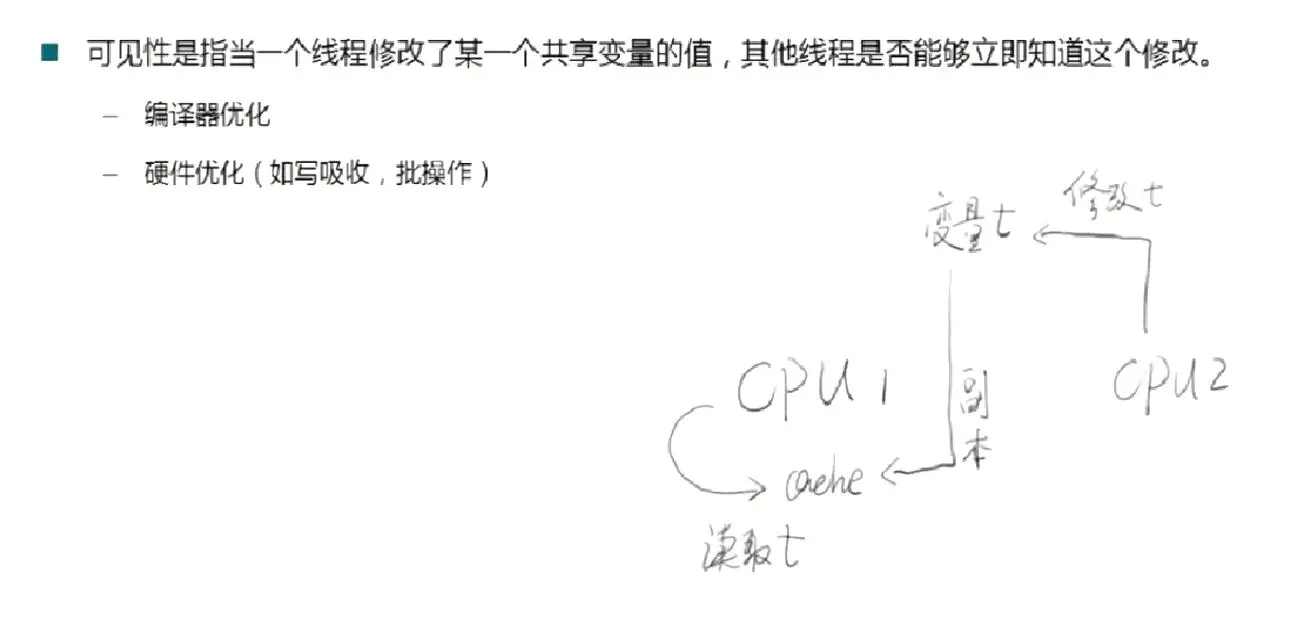 不同的cpu都有自己的寄存器,都有自己的cache(缓存区),一个变量可能被不同的CPU,不同的寄存器,不同的cache给缓存住,也就不能保证他们的之间一定是一致的会引发可见性问题。