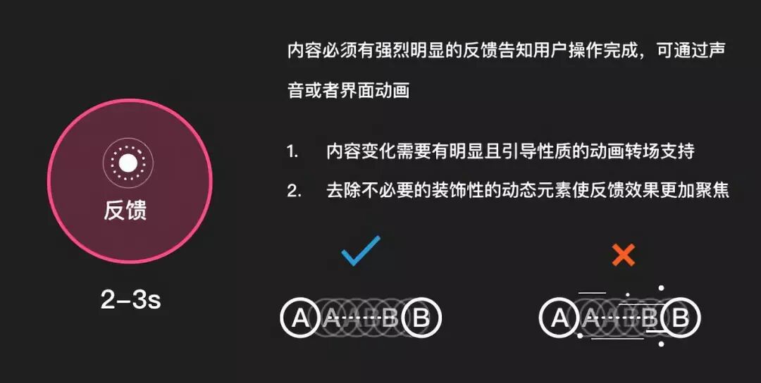内容在交互行为结束后,在第三秒的时间里必须有强烈明显的反馈告知用户操作成功,例如明确的点击效果反馈,可通过声音或者界面动画,但过于滞后(超过三秒)的动画反馈将脱离用户的有效感知时间,将不能很好的体现反馈本身的价值: