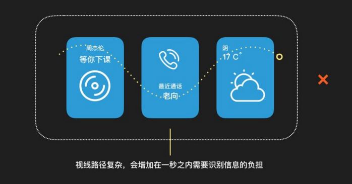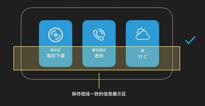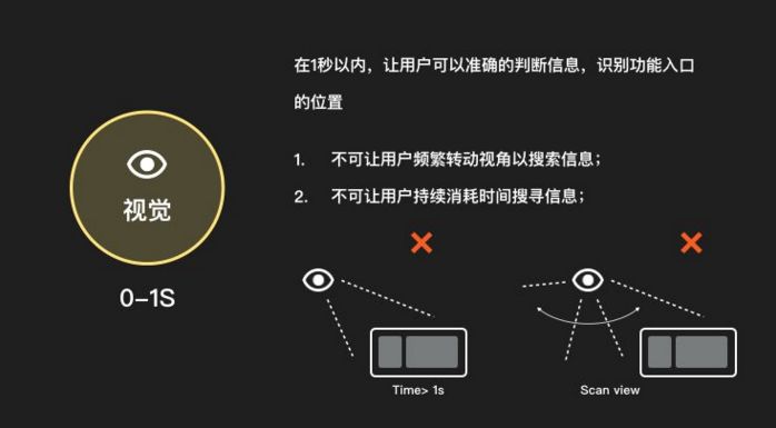 用户在0到1秒的时间内,对车机进行扫视,在这个过程中,应用场景的重点信息与功能入口必须能被用户在这个时间以内发现: