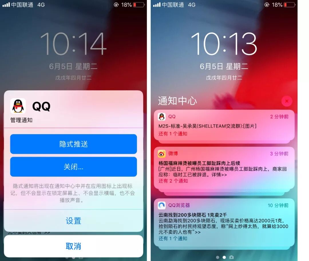 此外,还有「隐式推送」功能, 这类消息将只出现在通知栏上,虽然有消息角标,但不会出现在锁屏上,也不会显示横幅,不会播放声音。