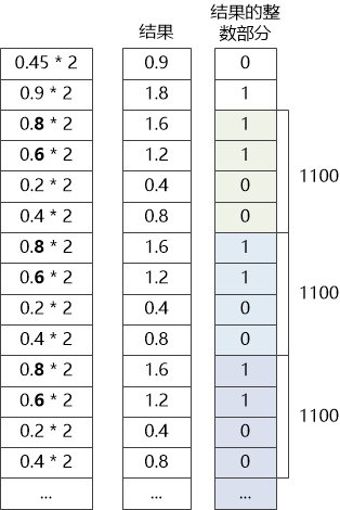(3) 尾数mantissa 是0.45 , 需要转化成二进制,怎么做呢? 也很简单,不断地乘2,取结果的整数部分就行,详细过程如下:
