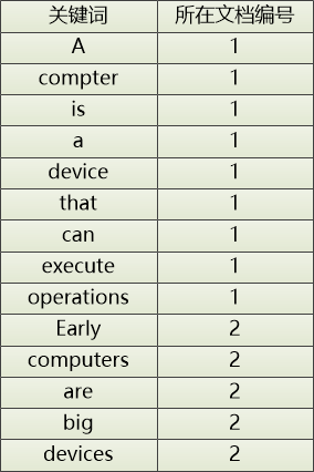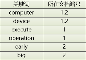 把这两篇文章中的单词都抽取出来,并且记录下这些单词出现在哪个文档中,这就形成了一个简单粗糙的倒排索引。