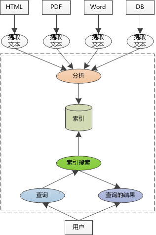 看看,不管你是什么类型的文档,HTML, PDF, Word,甚至是数据库的数据,只要能从中抽取出文本,就可以当作我的数据源,对文本做了分析以后,就可以存入索引库。