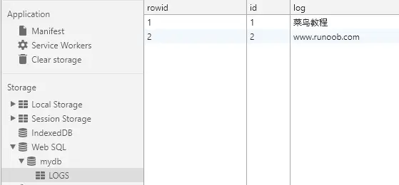 tx.executeSql('INSERT INTO LOGS (id, log) VALUES (1, "菜鸟教程")')