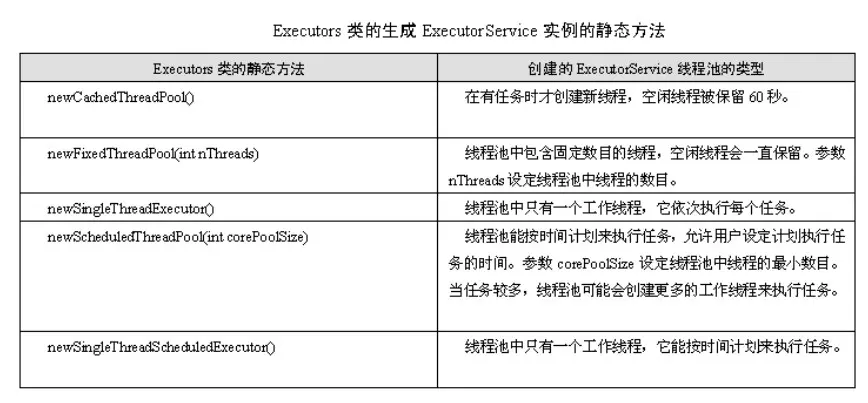 “强烈建议程序员使用较为方便的Executors工厂方法Executors.newCachedThreadPool()(无界线程池,可以进行自动线程回收)、Executors.newFixedThreadPool(int)(固定大小线程池)Executors.newSingleThreadExecutor()(单个后台线程)
