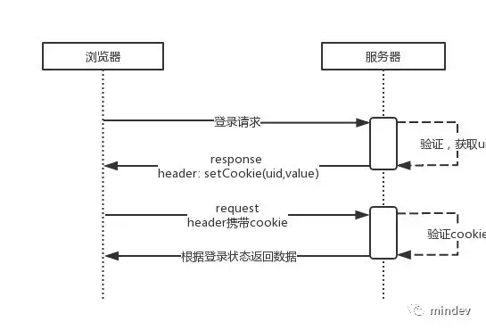 好了,明白了上面的2个概念。我们回顾一下传统基于浏览器的应用是如何解决这个问题的。浏览器环境下的登录状态保存通常使用cookie实现,这种方案的实现原理是浏览器发出的http请求的header中会携带客户端的cookie。如下图: