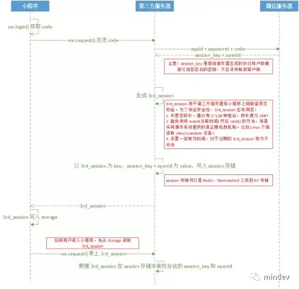 确定好了技术解决方案,小程序平台下实现自己的用户登录仍然有很多细节需要琢磨。我们首先看一下官方文档给出的第三方登录流程图: