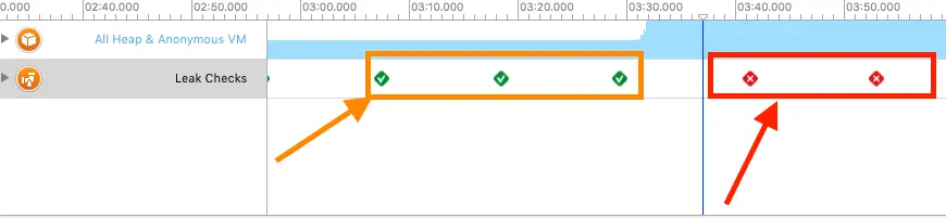 点击左上角的红色圆点,这时项目开始启动了,由于Leaks是动态监测,所以手动进行一系列操作,可检查项目中是否存在内存泄漏问题。如图所示,橙色矩形框中所示绿色为正常,如果出现如右侧红色矩形框中显示红色,则表示出现内存泄漏。
