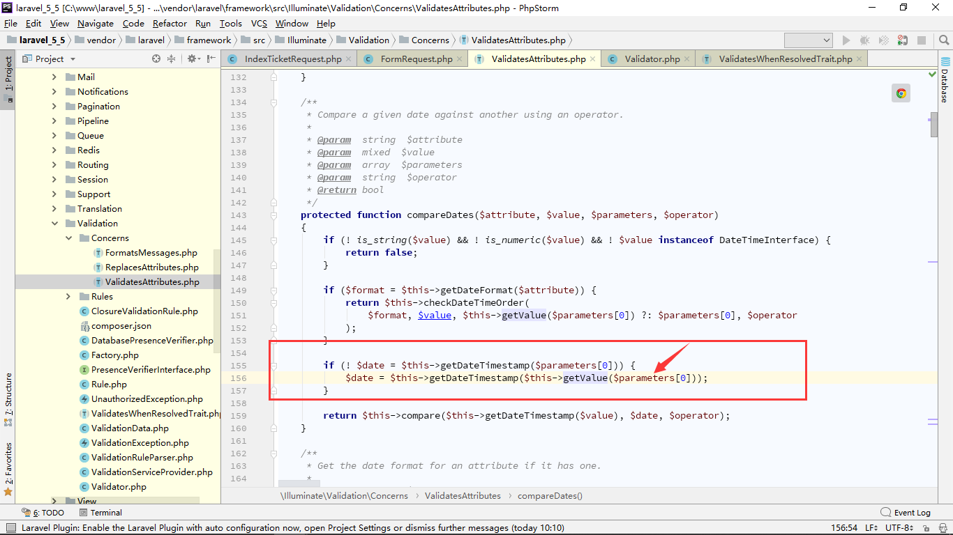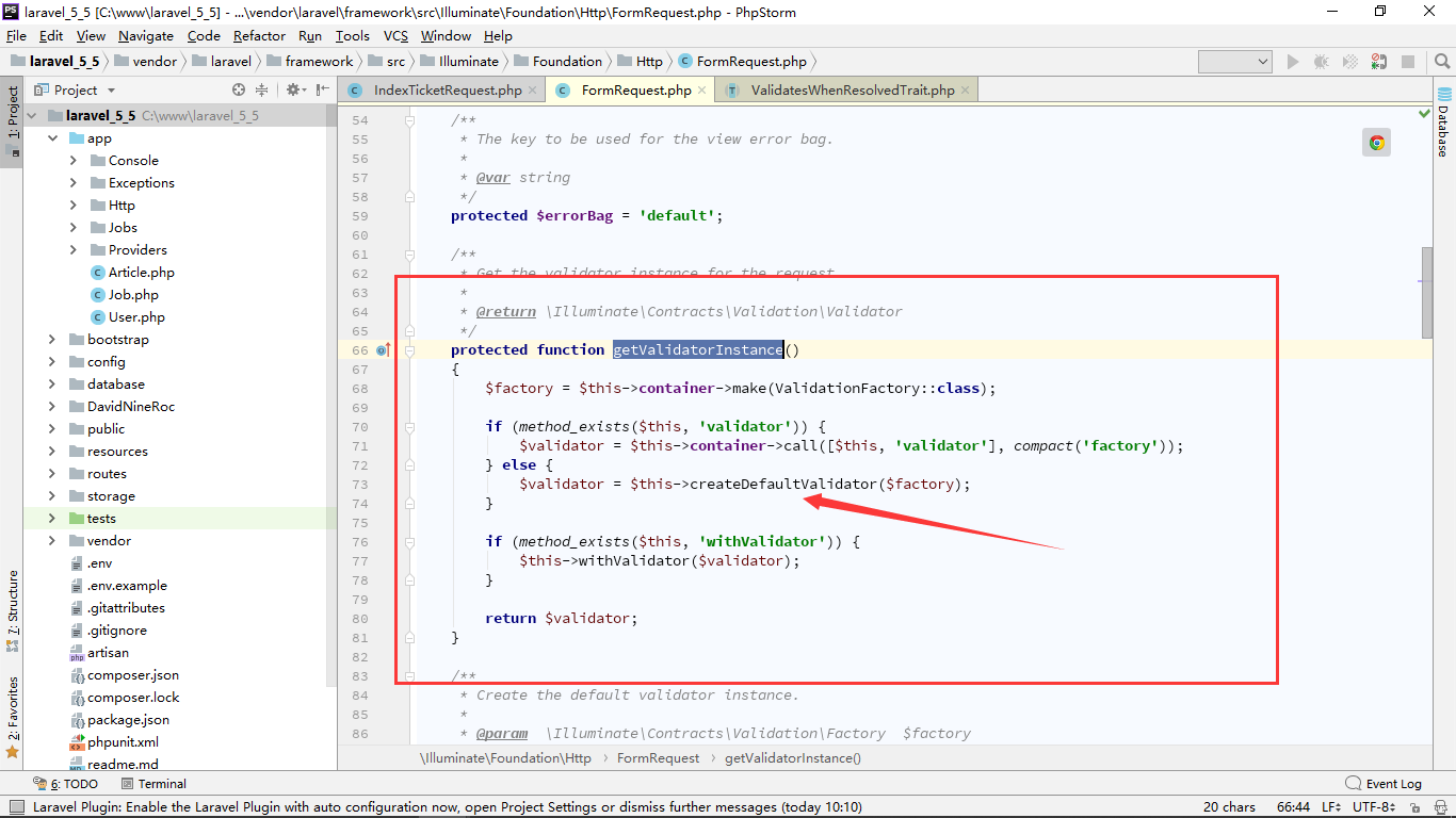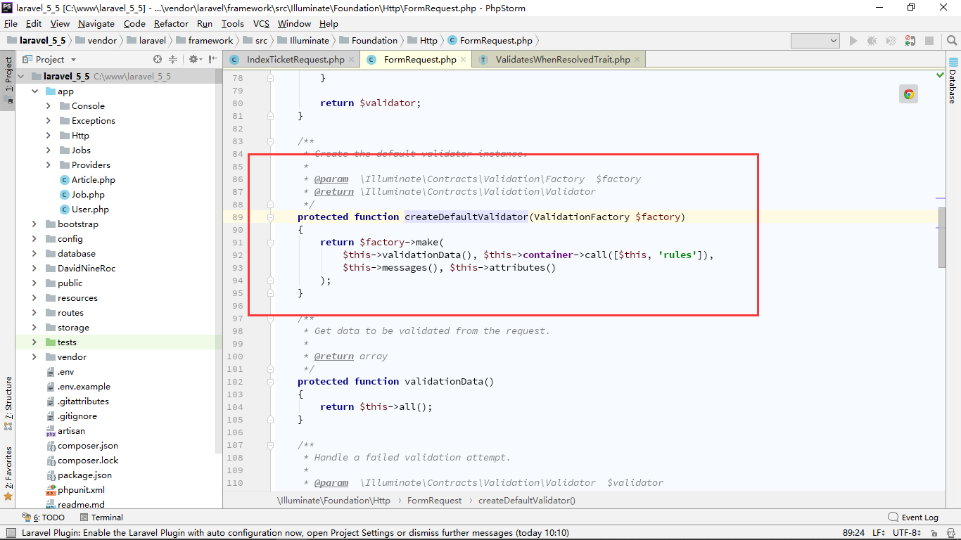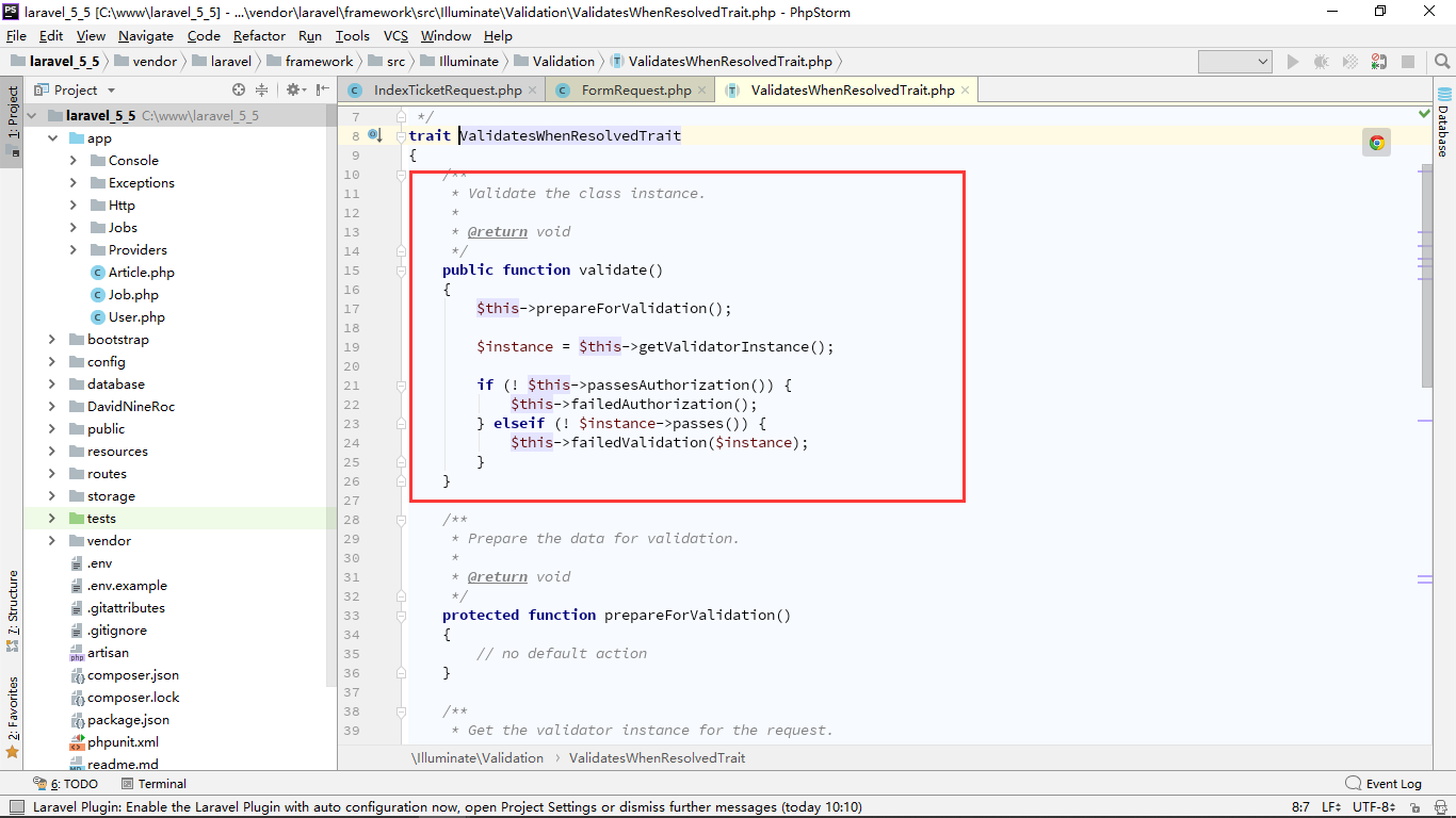 IndexTicketRequest类,没有这个方法,去到父类,发现实现了ValidatesWhenResolved,而validate是在trait的ValidatesWhenResolvedTrait