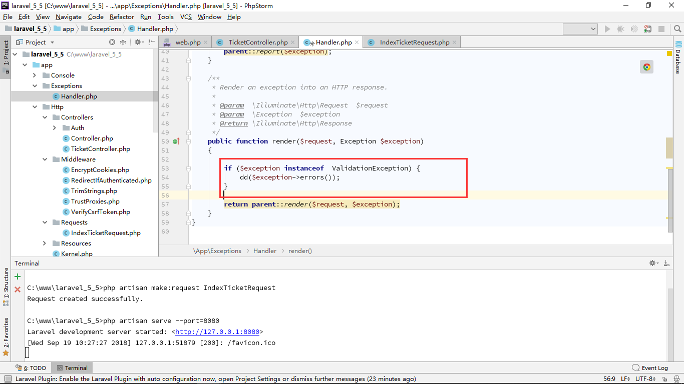 开始之前,为方便查看结果,在/Exceptions/Handler.php文件捕获了异常