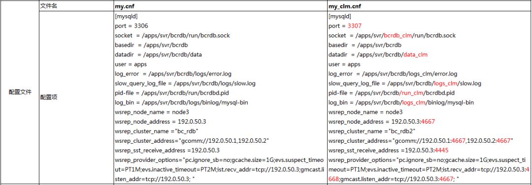 保留OP实例原my.cnf配置文件,为CLM实例创建新的配置文件my_clm.cnf,在配置文件中对mysql内外端口、数据目录、日志目录、pid、socket文件路径等参数进行重新配置,如下表所示: