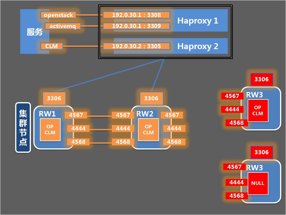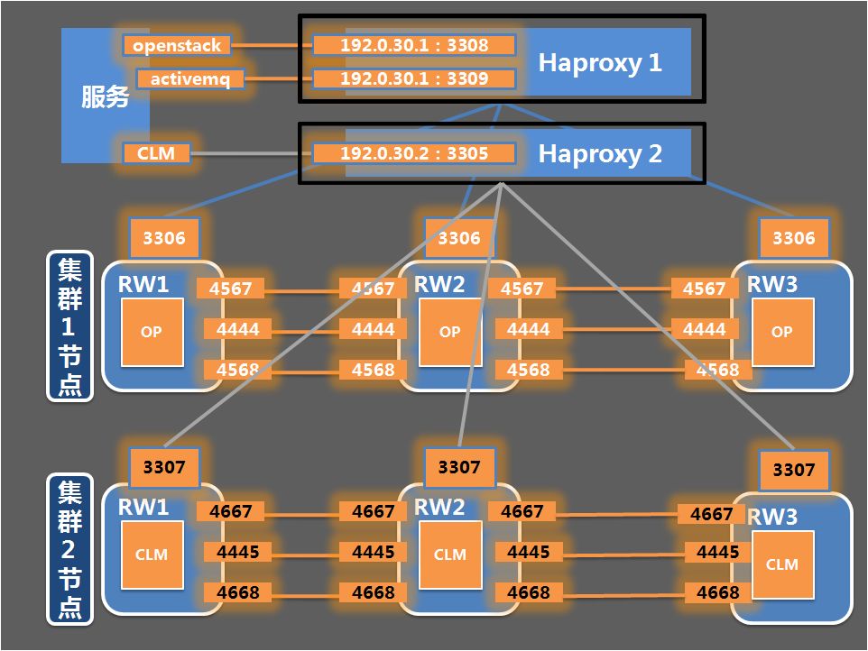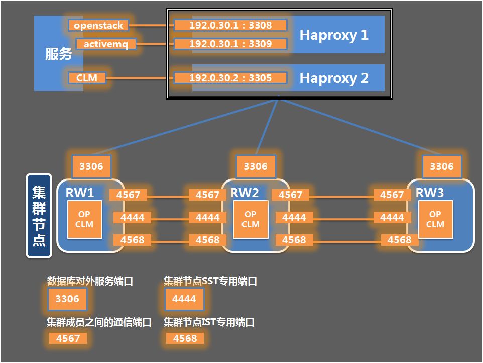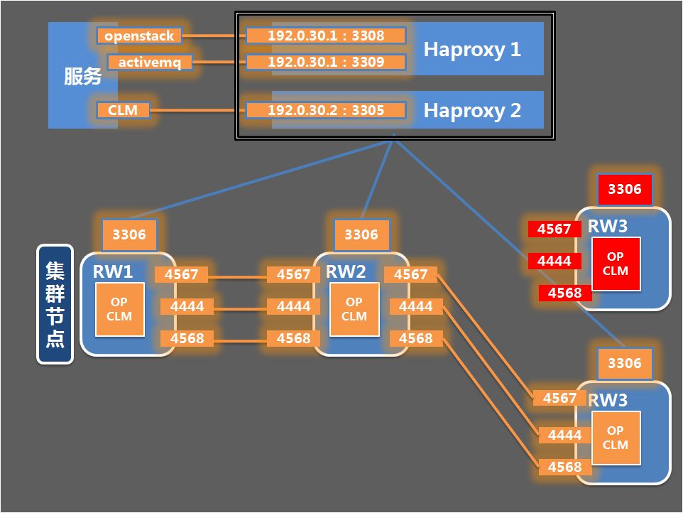 “移动云”生产环境PXC集群默认配置为多主的方式,每个节点都可以提供读写服务,不支持程序内指定实际物理IP,应用程序通过HAproxy负载均衡组件指定VIP连接数据库,如上图中openstack和activemq为OP相关服务,与CLM服务通过不同的虚拟IP和服务端口号进行区分,结合上层HAproxy+Keepalived可以实现集群的高可用。数据库对外服务端口为3306,集群成员之间的通信端口为4567,集群节点SST和IST专用端口分别为4444和4568 ,各节点使用TCP/IP协议通信。
