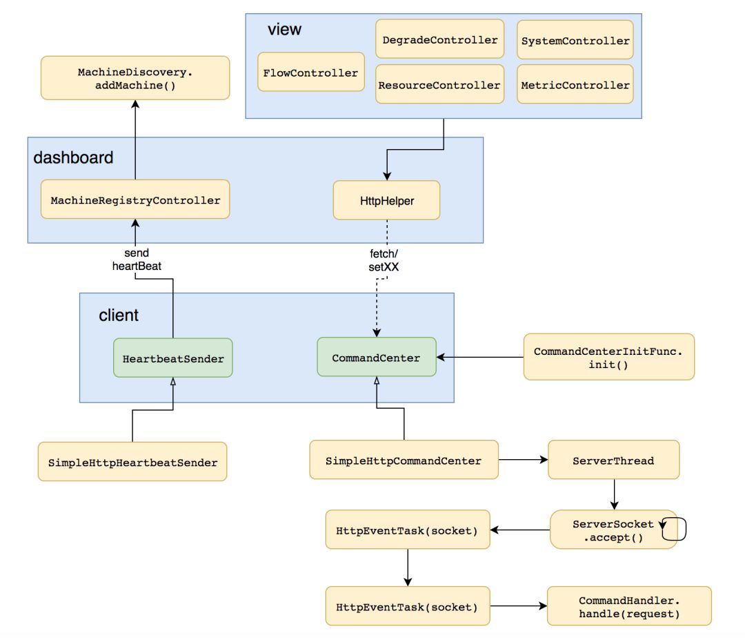 dashboard启动后会等待客户端的连接,具体的做法是在 MachineRegistryController 中有一个 receiveHeartBeat 的方法,客户端发送心跳消息,就是通过http请求这个方法。