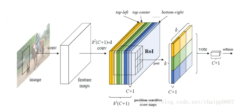 上面图中,feature maps后面那根线就是位置敏感卷积层,它的卷积核个数是K^2(C+1),其中K是超参数,在论文用的比较多的是k=3,K^2是Grid的个数,这个个数与位置敏感池化操作后的尺寸相关联的。C是物体的类别数量,加1是因为还有一个背景类。