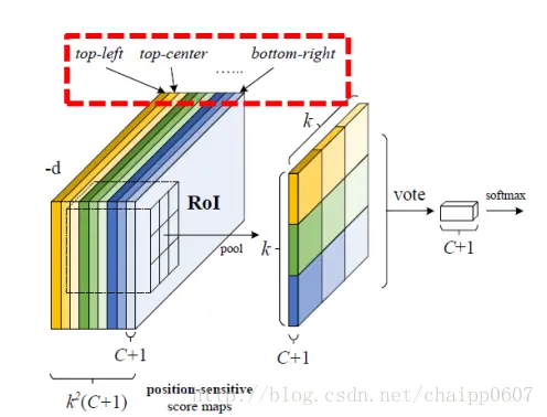 经过了这一层卷积之后的输出就是位置敏感分值图,分值图的宽高尺寸是与feature maps的宽高一致的,分值图的通道数就是K^2(C+1),即每一个类别都有K^2个通道。
