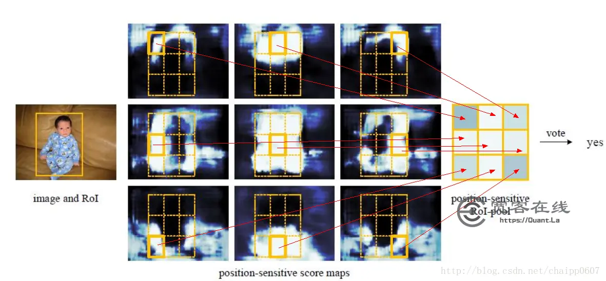 位置敏感分值图(Position-sensitive score maps) 它用来判断某一个框到底属于哪一个类别