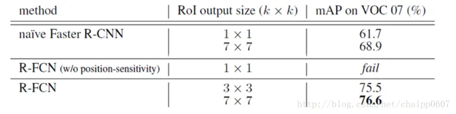 初始的Faster R-CNN RoI pooling的k选择为1时,mAP为61.7%,选择为7时,mAP为68.9%; R-FCN RoI pooling的k选择为1时是没有位置敏感信息的,直接fail,k选择为3和7时,mAP分别为75.5%与76.6%。