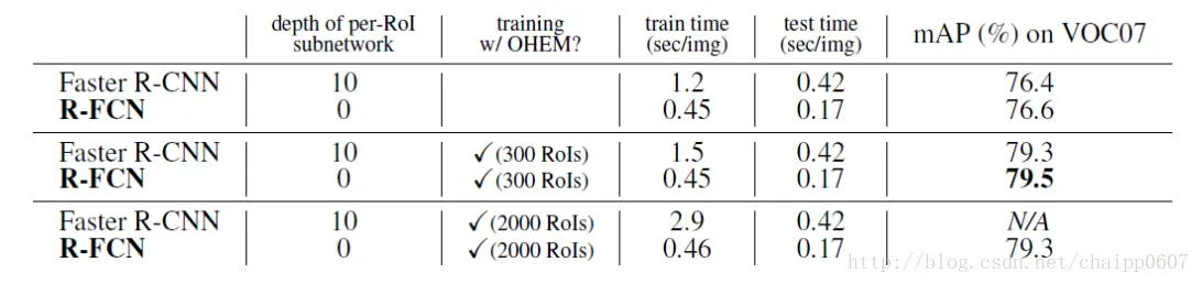 关注中间一行,在使用OHEM的情况下,以ResNet-101为初始模型的两个结构,单张训练时间,R-FCN比Faster R-CNN快3倍多,单张测试时间R-FCN比Faster R-CNN快2.5倍左右。而0.17s这个时间,和Faster R-CNN使用旧形态的CNN模型时间是差不多的,但是mAP确实79.5%,优于原来的69.9%。