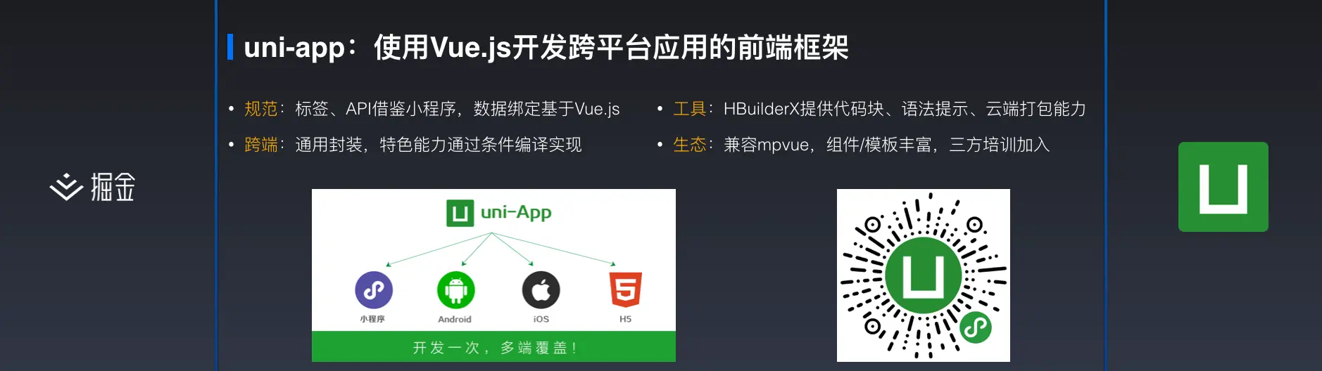 一句话介绍uni-app :一款基于vue的跨平台前端框架; 多说两句就是:开发者通过编写 Vue.js 代码,uni-app 将其编译到iOS、Android、微信小程序等多个平台,保证其正确运行并达到优秀体验。