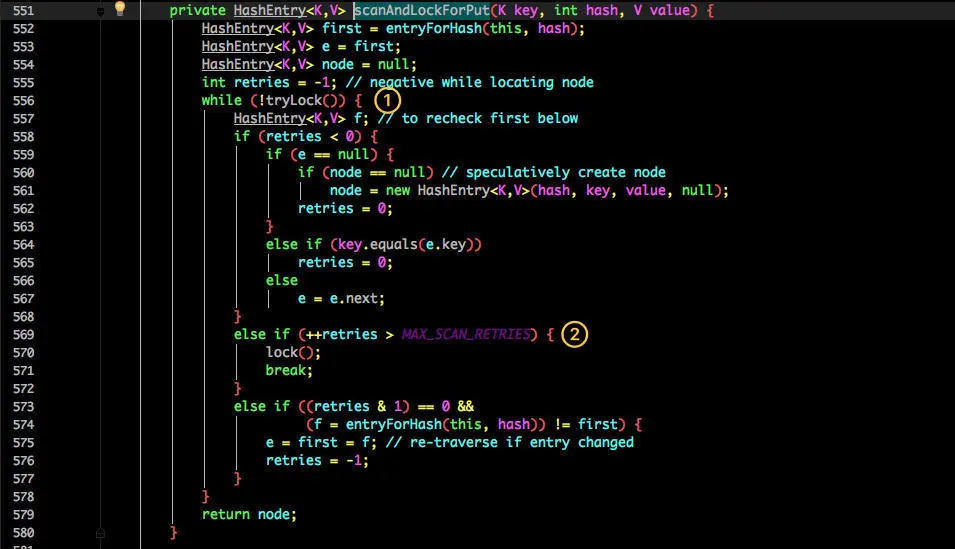 首先第一步的时候会尝试获取锁,如果获取失败肯定就有其他线程存在竞争,则利用 scanAndLockForPut() 自旋获取锁。