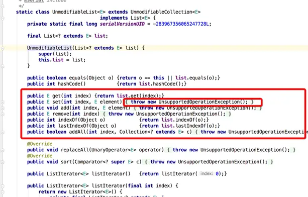 我们可以看到UnmodifiableList内对集合的操作都会抛出异常,所以返回的集合,列表对象是不可变的。
