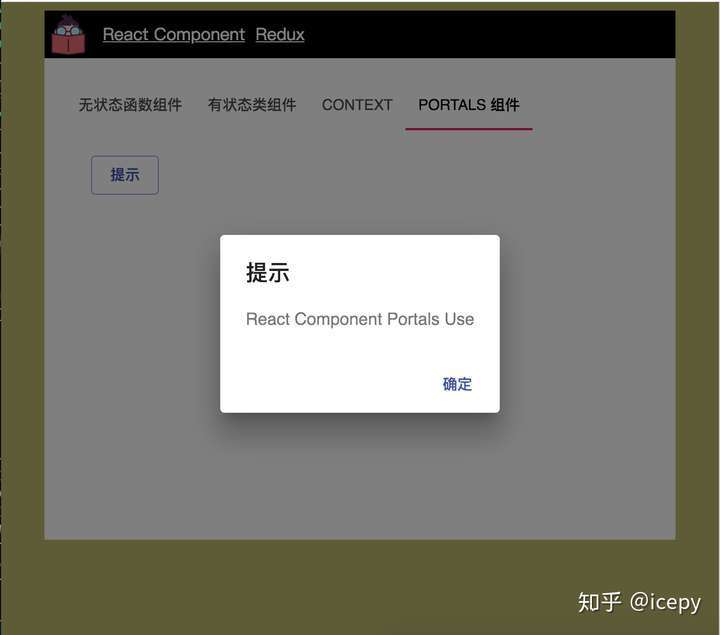 最后在 render 方法中使用 ReactDOM.createPortal 来创建一个全局的 Alert,如: