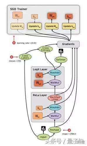 TensorFlow使用数据流图,上面是一个TensorFlow的示意图。我们不用关心这张图具体代表什么,但你需要知道,其中的椭圆和正方形代表节点,节点就是一些数学函数,你可以将节点分组形成各种数学计算,并得到输出。