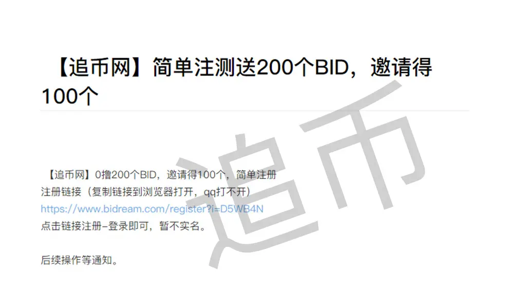 前期的社群运营已经积累了海量的用户覆盖及精准的KOL社群资源,我们的产品也有了抓住用户注意力的全新概念,那就顺水推舟给他一个注册的理由——简单注册送200BID,再给他一个裂变诱饵——邀请好友送100BID。