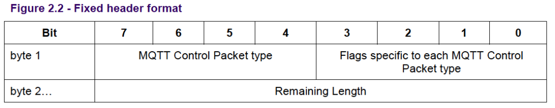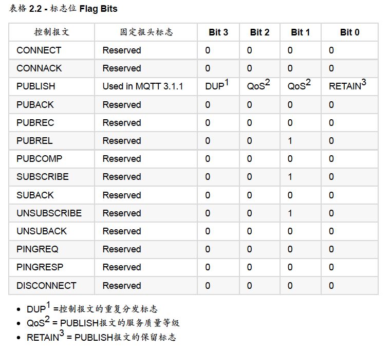 第一个字节的二进制位3-0包含每个MQTT控制报文类型特定的标志, 控制报文中的标志为必须按照如下表格进行设置,如果设置有问题,则接收者必须断开连接。