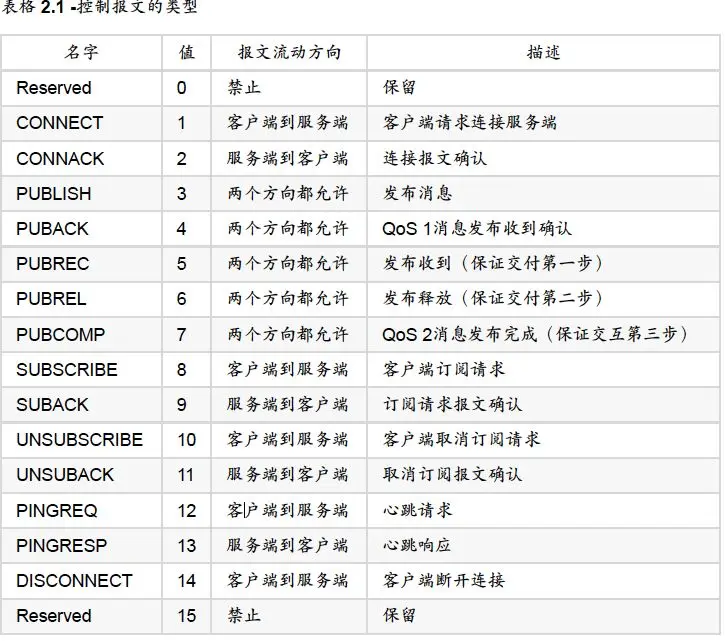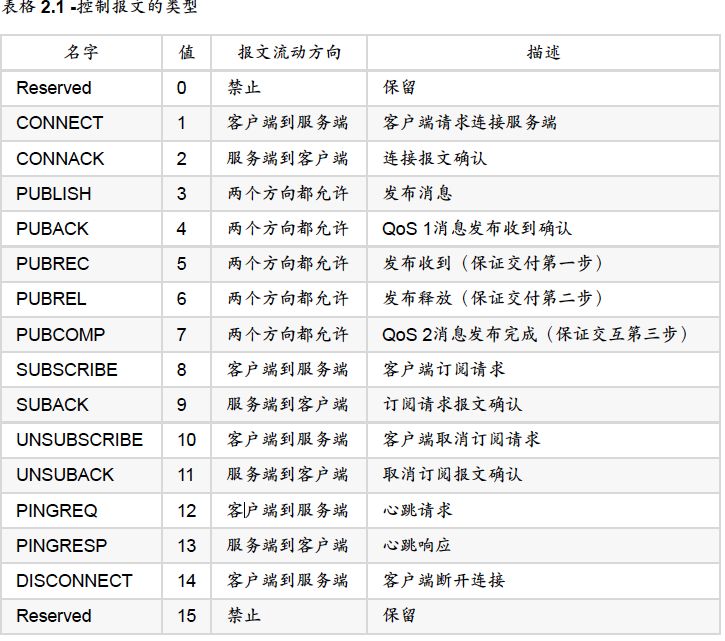 第一个字节的二进制位7-4无符号整数表示控制报文的类型,具体类型对应的值为: