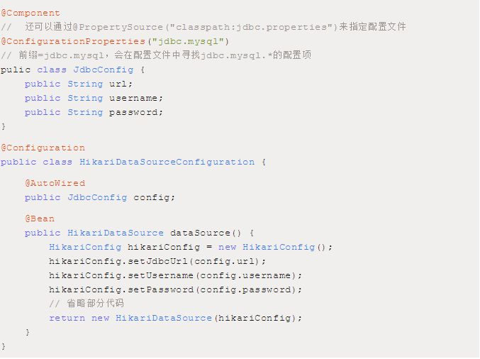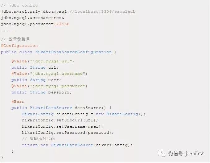 当某些属性的值需要配置的时候,我们一般会在 application.properties文件中新建配置项,然后在bean中使用 @Value注解来获取配置的值,比如下面配置数据源的代码。