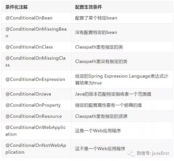 SpringBoot定义了很多有趣的条件,并把他们运用到了配置类上,这些配置类构成了 SpringBoot的自动配置的基础。 SpringBoot运用条件化配置的方法是:定义多个特殊的条件化注解,并将它们用到配置类上。下面列出了 SpringBoot提供的部分条件化注解: