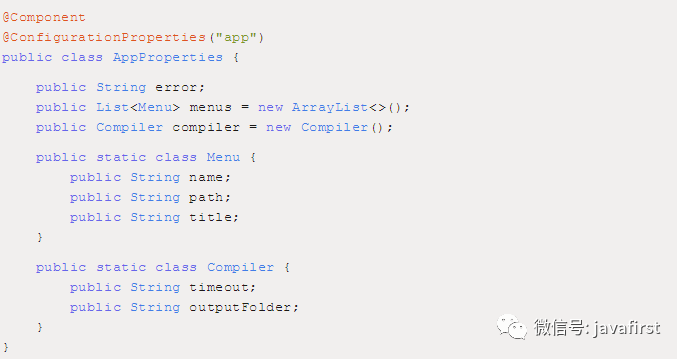 使用 @Value注解注入的属性通常都比较简单,如果同一个配置在多个地方使用,也存在不方便维护的问题(考虑下,如果有几十个地方在使用某个配置,而现在你想改下名字,你改怎么做?)。对于更为复杂的配置,Spring Boot提供了更优雅的实现方式,那就是 @ConfigurationProperties注解。我们可以通过下面的方式来改写上面的代码: