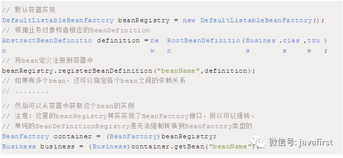 DefaultListableBeanFactory作为一个比较通用的BeanFactory实现,它同时也实现了BeanDefinitionRegistry接口,因此它就承担了Bean的注册管理工作。从图中也可以看出,BeanFactory接口中主要包含getBean、containBean、getType、getAliases等管理bean的方法,而BeanDefinitionRegistry接口则包含registerBeanDefinition、removeBeanDefinition、getBeanDefinition等注册管理BeanDefinition的方法。