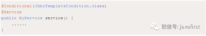 这个例子中只有当 JdbcTemplateCondition类的条件成立时才会创建MyService这个bean。也就是说MyService这bean的创建条件是 classpath里面包含 JdbcTemplate,否则这个bean的声明就会被忽略掉。