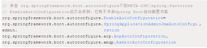 这个类会扫描所有的jar包,将所有符合条件的@Configuration配置类注入的容器中,何为符合条件,看看 META-INF/spring.factories的文件内容: