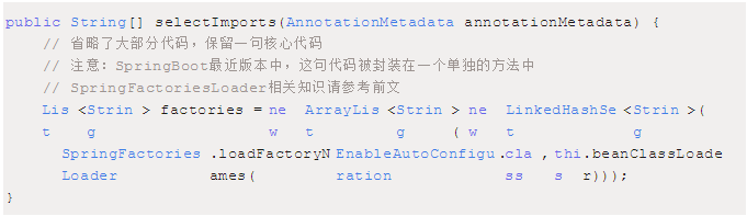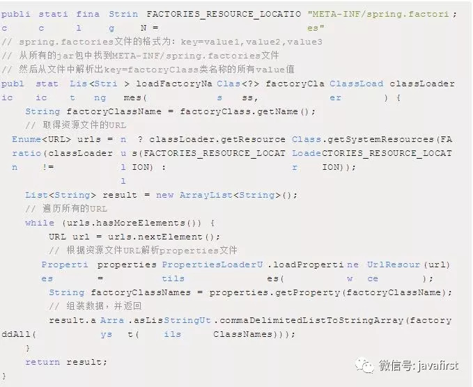 这就是 SpringFactoriesLoader,它本质上属于Spring框架私有的一种扩展方案,类似于SPI,Spring Boot在Spring基础上的很多核心功能都是基于此,希望大家可以理解。