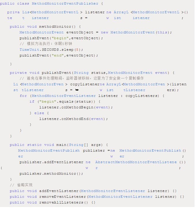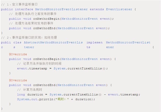 在合适的时机发布事件。此例中的methodMonitor()方法是事件发布的源头,其在方法执行之前和结束之后两个时间点发布MethodMonitorEvent事件,每个时间点发布的事件都会传给相应的监听器进行处理。在具体实现时需要注意的是,事件发布是顺序执行,为了不影响处理性能,事件监听器的处理逻辑应尽量简单。