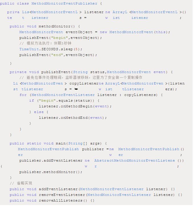 事件监听器的管理。publisher类中提供了事件监听器的注册与移除方法,这样客户端可以根据实际情况决定是否需要注册新的监听器或者移除某个监听器。如果这里没有提供remove方法,那么注册的监听器示例将一直被MethodMonitorEventPublisher引用,即使已经废弃不用了,也依然在发布者的监听器列表中,这会导致隐性的内存泄漏。