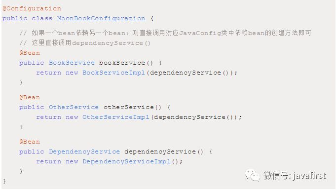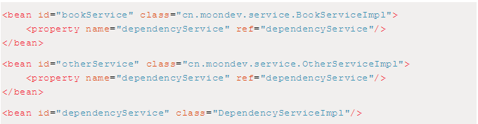 你可能注意到这个示例中,有两个bean都依赖于dependencyService,也就是说当初始化bookService时会调用 dependencyService(),在初始化otherService时也会调用 dependencyService(),那么问题来了?这时候IOC容器中是有一个dependencyService实例还是两个?这个问题留着大家思考吧,这里不再赘述。