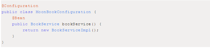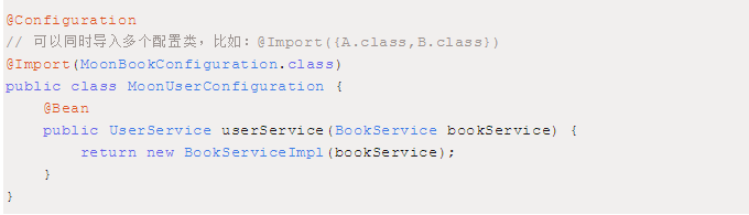 现在有另外一个配置类,比如: MoonUserConfiguration,这个配置类中有一个bean依赖于MoonBookConfiguration中的bookService,如何将这两个bean组合在一起?借助 @Import即可: