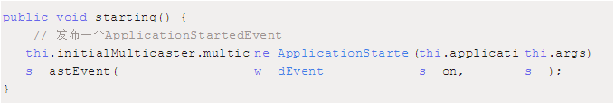 SpringApplicationRunListener只有一个实现类: EventPublishingRunListener。①处的代码只会获取到一个EventPublishingRunListener的实例,我们来看看starting()方法的内容: