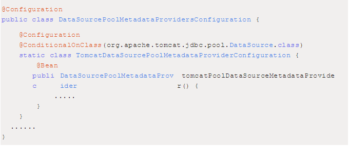 DataSourcePoolMetadataProvidersConfiguration是数据库连接池提供者的一个配置类,即Classpath中存在 org.apache.tomcat.jdbc.pool.DataSource.class,则使用tomcat-jdbc连接池,如果Classpath中存在 HikariDataSource.class则使用Hikari连接池。